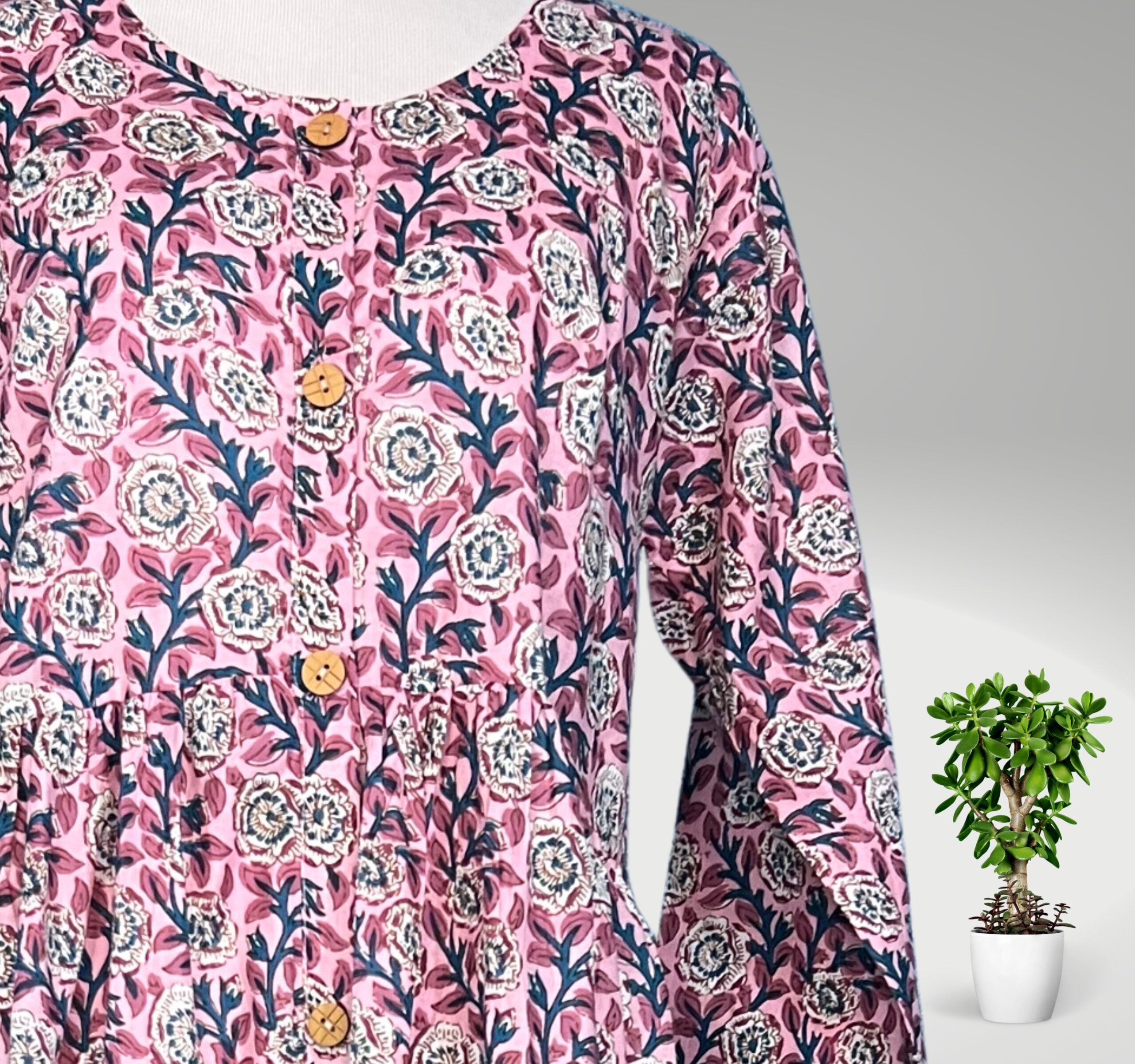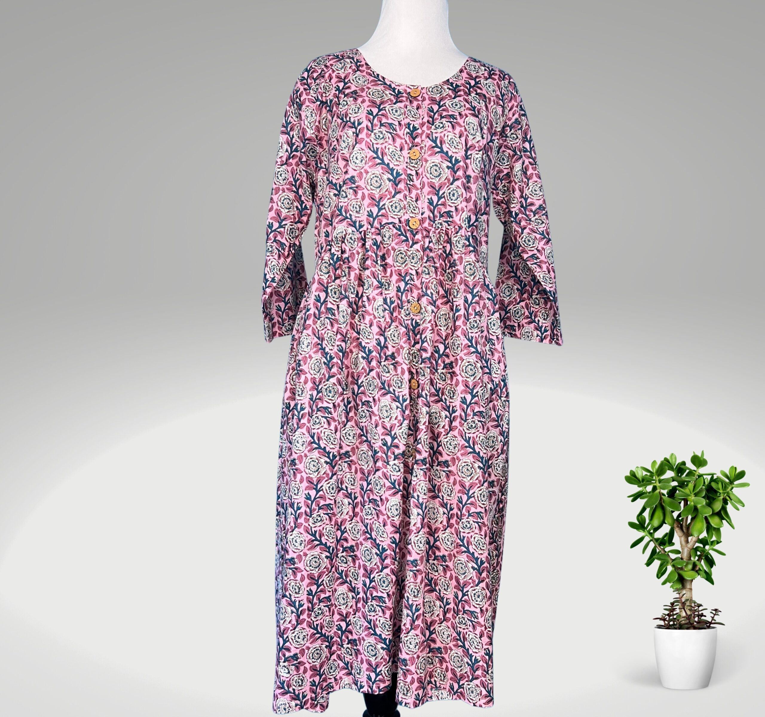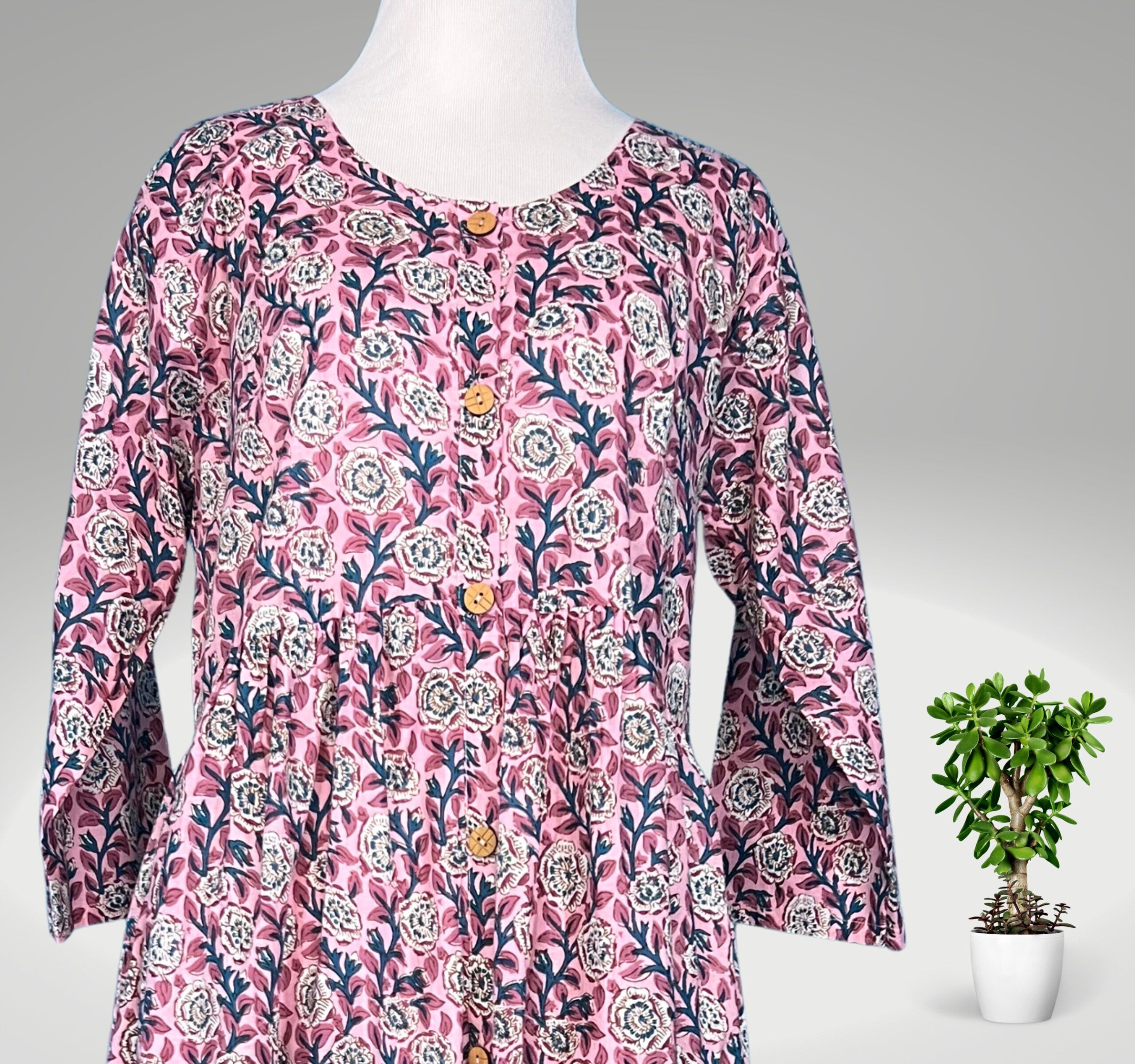 It is made of organic cotton and features a light to mid-weight cotton hand block print done by local artists. the dress is pre-washed and has no stretch. Experience the elegance of Indian craftsmanship with our exquisite handmade block print organic fabric dress for women.